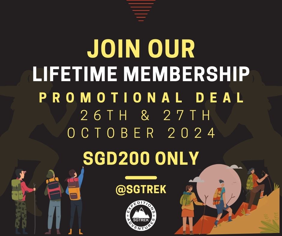 For just SGD 200, sign up for the SGTREK Lifetime Membership during The Outdoor Fair Vol. 2 on 26th & 27th October 2024 and unlock exclusive deals on adventure tours and discounts on outdoor gear from our partners! This offer is only valid for the two-day event, so don’t miss your chance to enjoy lifetime benefits and become part of the SGTREK community.